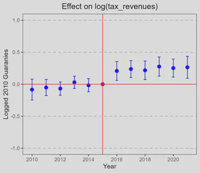 This paper presents evidence on the effects of intergovernmental transfers on financial outcomes of local governments in Paraguay. By incorporating census adjustments that affected the expected transfers to municipalities, I construct two treatment arms and a comparison group. Municipalities with a 15% or greater decrease in their expected transfers increased their tax revenues by 14%, whereas those with a 15% or greater increase in expected transfers decreased their tax revenues by 26%. Furthermore, total expenditures in the first group increased, but decreased in the latter. Beyond fiscal outcomes, the paper explores the broader implications of these transfers on local development and political dynamics. While enrollment in public schools shows little systematic change, there is a noticeable 8% increase in night lights radiance-a proxy for economic activity-in municipalities with more funds. On the political side, citizens in high-transfer municipalities were significantly less likely to vote in both national and mayoral elections, consistent with political disengagement when local governments rely heavily on external resources. There is also suggestive evidence that mayors in these municipalities were less likely to seek reelection and more likely to transition into central government positions, though these patterns do not reach conventional levels of statistical significance. No systematic effects are observed on mayors’ personal wealth, as measured by self-reported asset disclosures.